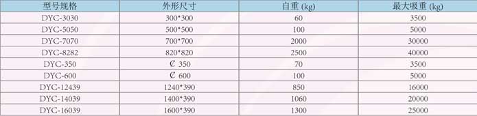 DYC 系列電永磁吸盤廣泛應(yīng)用于冶煉、鑄造和交通運輸部門作為搬運鋼錠和大型初軋鋼、型鋼。針對不同類型的鋼材采用不同的磁路設(shè)計,該系列產(chǎn)品又分為吊運初軋坯,梁坯等場合的方型電永磁吸盤;吊運成卷鋼材(卷園或盤園)及圓坯的多極型電永磁吸盤;以及吊運小型鋼板、鋼坯的圓形電永磁吸盤。主要特點,1、結(jié)構(gòu)簡單,操作方便。2、耗能低,維護簡便。3、斷電不失磁,無需停電保磁保護裝置,工作安全可靠。4、具有調(diào)磁功能。5、吸力大,重量輕。