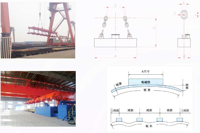 本系列產(chǎn)品專為吊運(yùn)鋼板而設(shè)計(jì),吊運(yùn)作業(yè)安全、迅速、準(zhǔn)確。選型時(shí)應(yīng)考慮作業(yè)時(shí)鋼板彎曲變形將影響安全搬運(yùn),必須注意電磁鐵的長(zhǎng)度與鋼板厚度和板寬之間的關(guān)系,同時(shí)考慮長(zhǎng)鋼板吊運(yùn)時(shí)可能出現(xiàn)彎曲變形而影響安全搬運(yùn),所以在吊運(yùn)長(zhǎng)尺寸鋼板時(shí),請(qǐng)使用多臺(tái)電磁鐵聯(lián)用,對(duì)于中厚板(6mm~32mm)電磁鐵的間距以3~4 米為宜,兩端外伸部分的長(zhǎng)度取間距的二分之一。